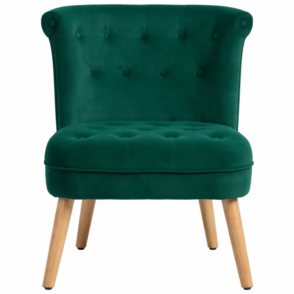 Questa poltroncina in velluto offre un design con trapuntatura a bottoni e schienale con piccole alette esterne, adatta a diversi ambienti. Il tessuto vellutato rende la seduta e lo schienale morbidi al tatto. La struttura con gambe in legno assicura stabilità e durabilità. Questa sedia è ideale per momenti di relax o come posto a sedere aggiuntivo in sala da pranzo.